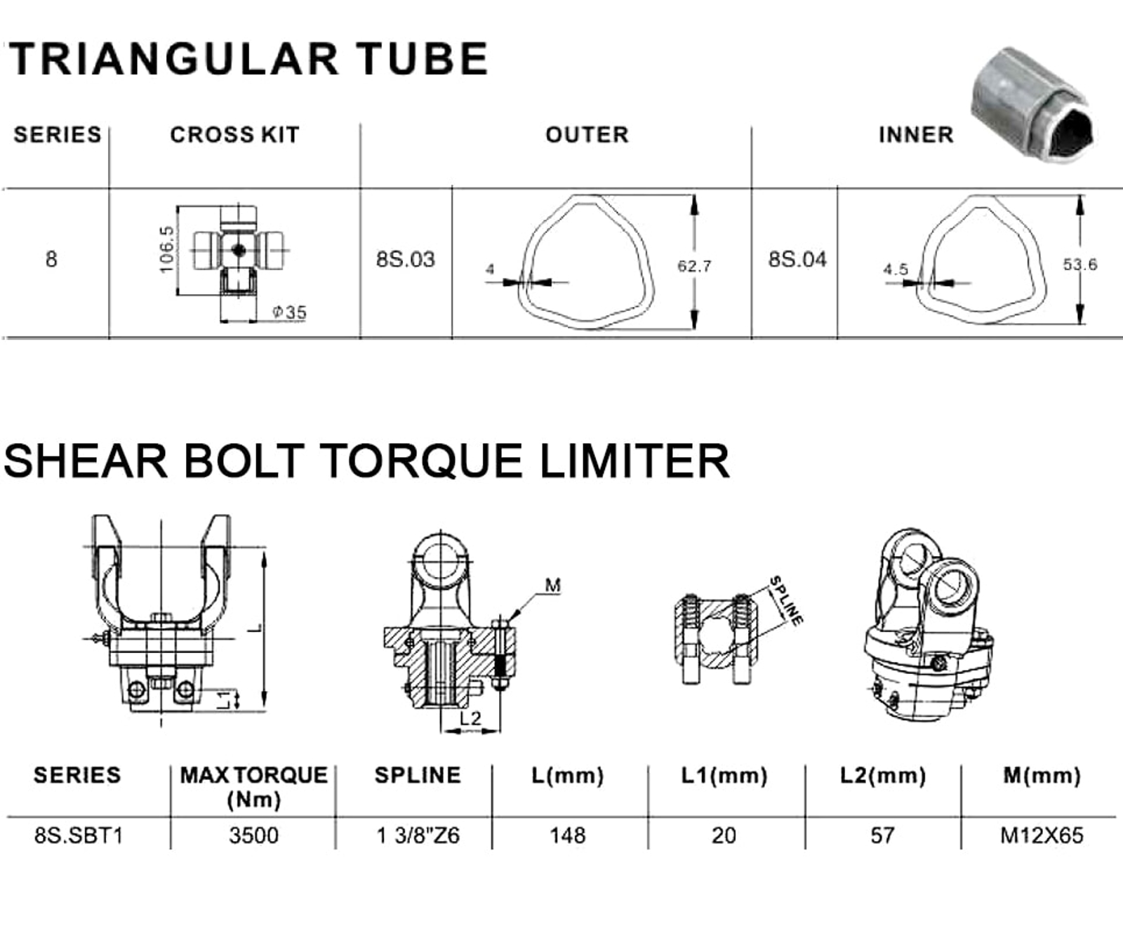 This device prevents overloading by means of a shear bolt of specified size. When the bolt shears off, the hub and yoke assembly is kept together by a ball bearing ring which allows the two parts to rotate independent of each other. It is mounted on the implement side.