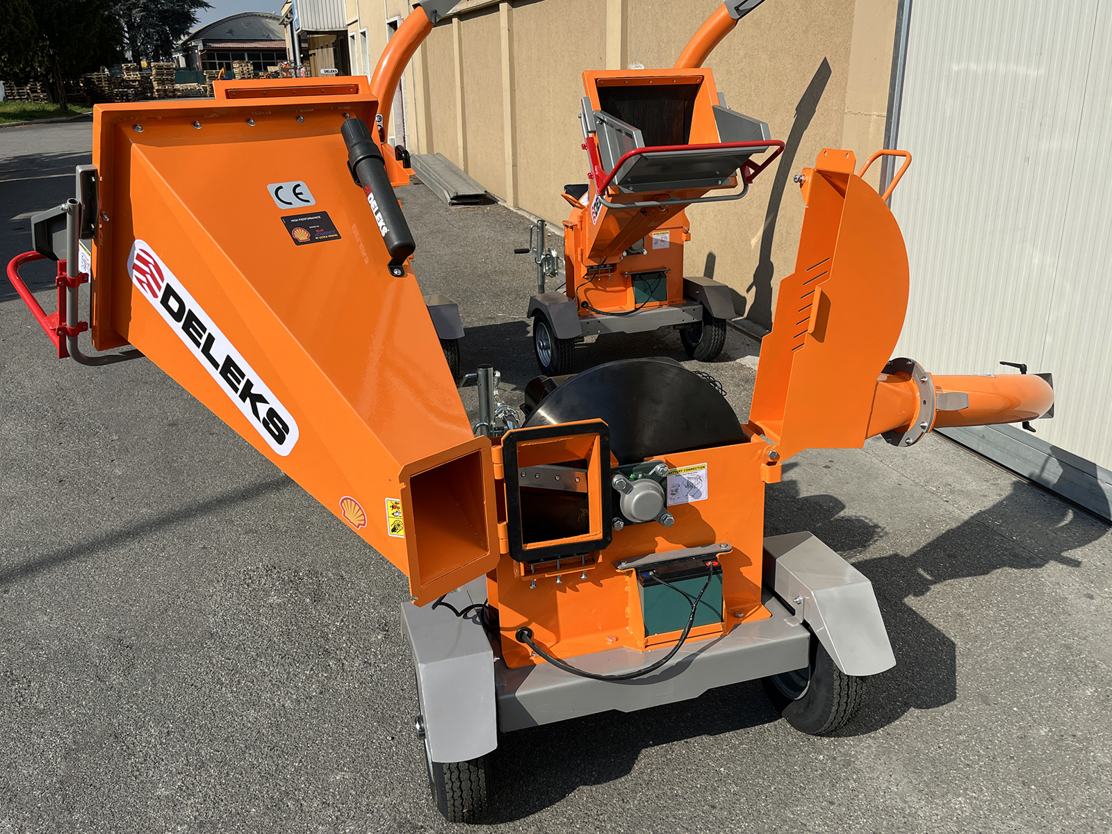 CLOSEProfessional wheeled wood chipper DELEKS® DK-900 HONDA powered by a Honda GX390 petrol engine delivering 13.5 HP, with electric start, designed for intensive chipping of dry and green wood up to 12 cm in diameter.